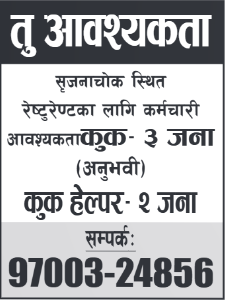तु आवश्यकता सृजनाचोक स्थित रेष्टुरेण्टका लागि कर्मचारी आवश्यकता