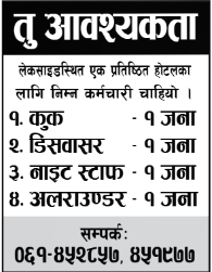 तु आवश्यकता लेकसाइडस्थित एक प्रतिष्ठित होटलका लागि निम्न कर्मचारी चाहियो ।