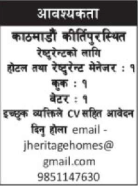 आवश्यकता काठमाडौं कीर्तिपुरस्थित रेष्टुरेन्टको लागि होटल तथा रेष्टुरेन्ट मेनेजर १