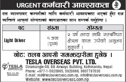नोट: तलब आपसी समझदारीमा हुनेछ । TESLA OVERSEAS PVT. LTD.