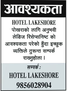 आवश्यकता पोखराको लागि अनुभवी लेडिज रिसेप्सनिष्ट को आवश्यकता परेको हुँदा इच्छुक व्यक्तिले तुरून्त सम्पर्क राख्नुहोला ।