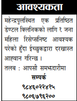 आवश्यकता महेन्द्रपुलस्थित एक प्रतिष्ठित डेण्टल क्लिनिकको लागि १ जना महिला रिसेप्सनिष्ट आवश्यक परेको हुँदा ईच्छुकद्वारा दरखास्त आह्वान गरिन्छ ।